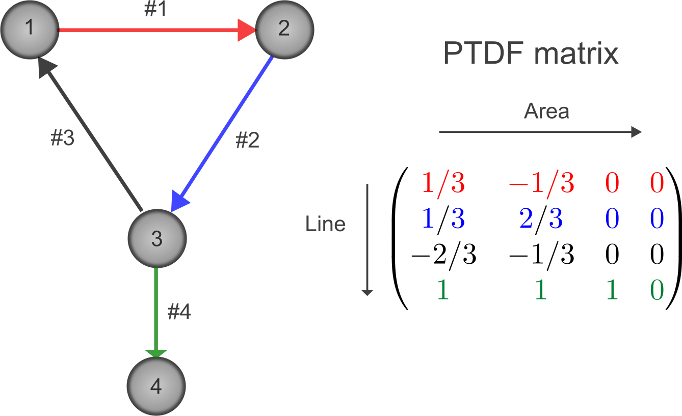 We here outline the our conventions regarding FBMC applied to a system comprised of four areas with the fourth area/node acting as a “slack node” – i.e., a node which does not provide any injection of current into the system. Adopting a convention of letting rows denote AC lines while the columns denote areas/nodes we have the following intuitive picture: Considering the first column of the matrix, we see that a net position/net injection of 1 MW on node 1 distributes along lines 1,2,3,4 with 1/3, 1/3, -2/3 and 1 MW, respectively.
