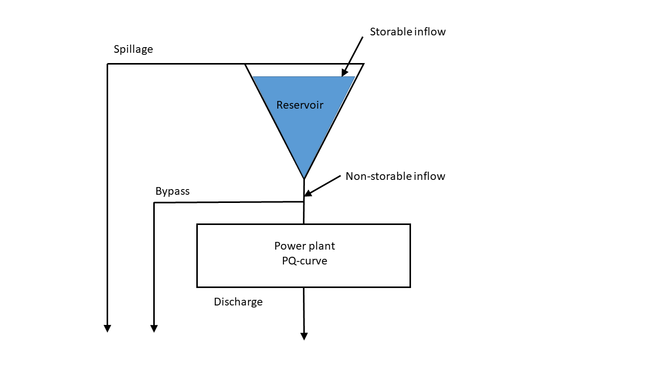 The figure below illustrates a module, comprising a reservoir with a downstream power plant, and with the basic variables involved. Inflow enters the reservoir, while Unregulated Inflow goes directly to the plant. There are three main waterways modeled: discharge, bypass, and spillage. These may be connected to downstream reservoirs or go directly to the sea, and the three waterways are allowed to follow different paths.